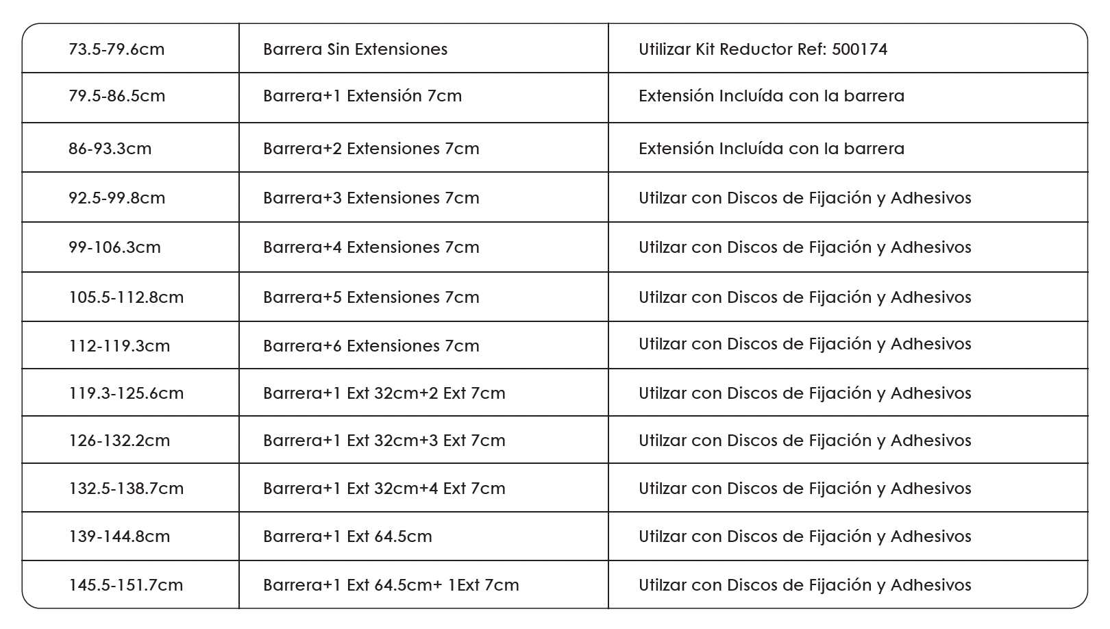 Ancho: 73,5-79,6cm (incluye 2 extensiones pudiendo llegar hasta 93,3cm)